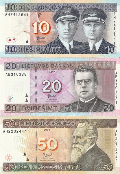 Литовские банкноты. 10, 20 и 50 литовских лит