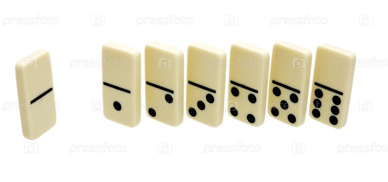 Стоящие кости семи домино на белом фоне