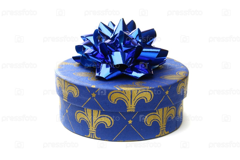 Подарочная коробка с синим бантом на белом фоне