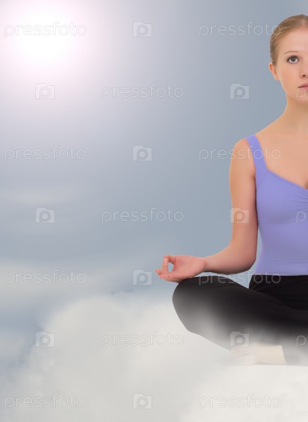 Женщина медитирует, сидя на облаке