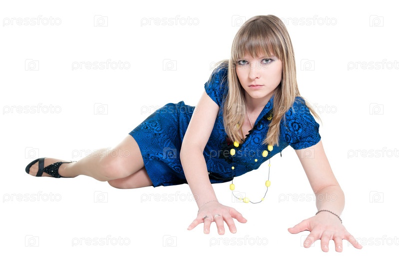 Девушка в синем платье на белом фоне