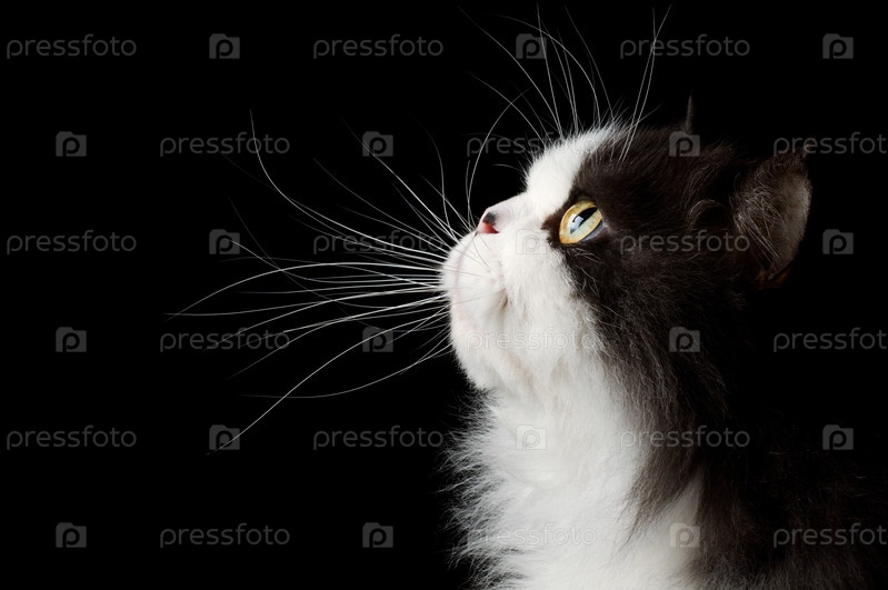 Кошка смотрит вверх на черном фоне