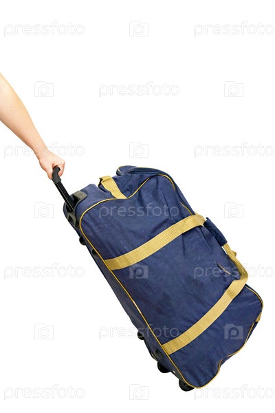 Синяя сумка на колесах на белом фоне