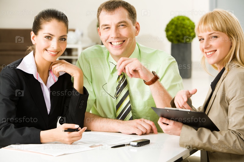 Фото дружеских деловых людей, сидящих за столом и смотрящих на камеру во время рабочей встречи