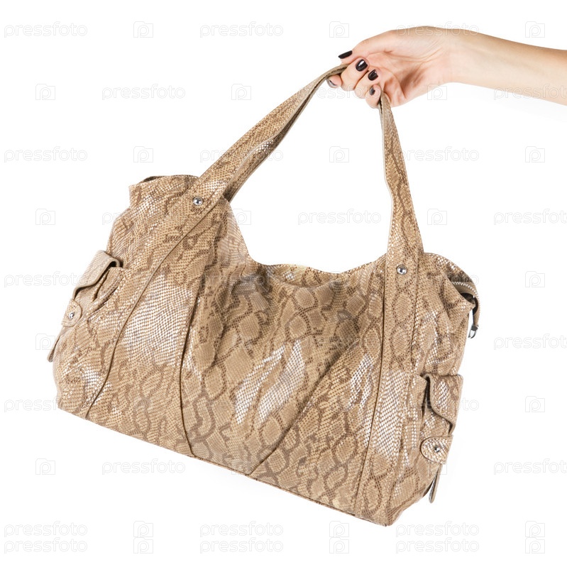 Бежевая кожаная сумка в женской руке, белый фон