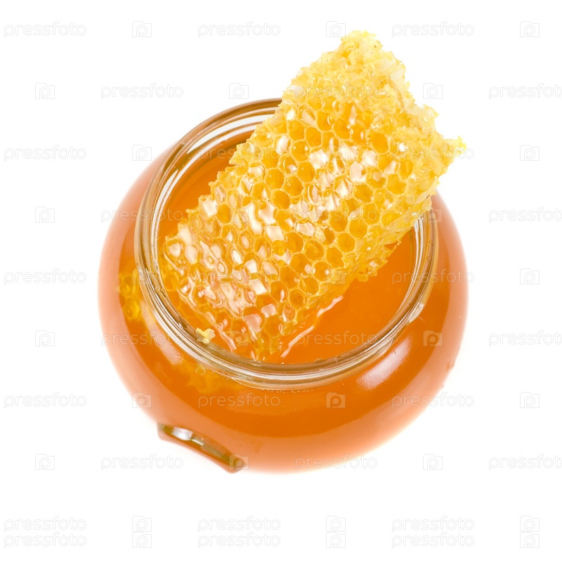 Банка с медом и сотами на белом фоне