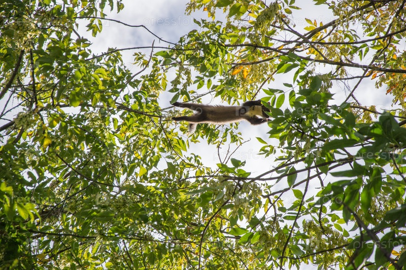 Лесная куница среди зеленых листьев и ветвей деревьев
