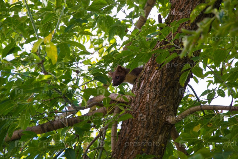 Лесная куница среди зеленых листьев и ветвей деревьев