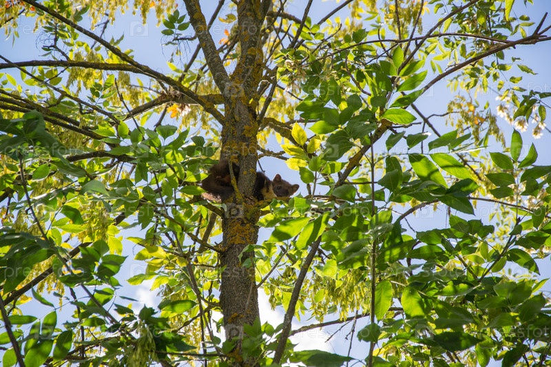 Лесная куница среди зеленых листьев и ветвей деревьев