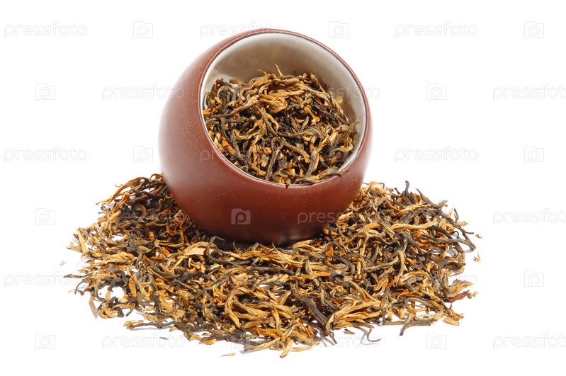 Чашка с сушеным китайским чаем на белом фоне