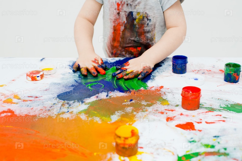 Маленький мальчик, играя с красками