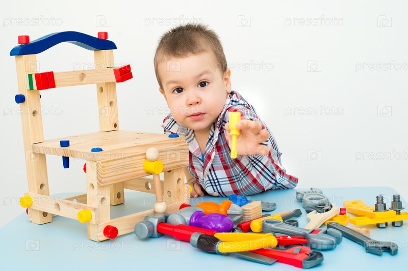 Прелестный ребенок играет с игрушками деревянное здание