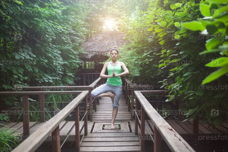 Молодая женщина делает Йога Асана вечером