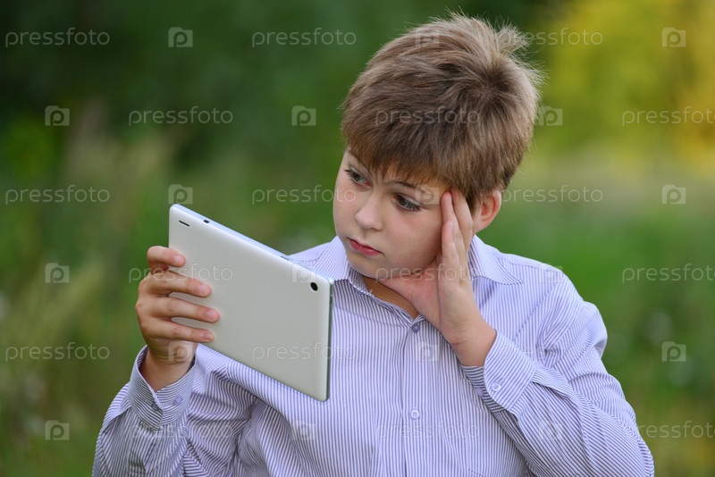 Подросток мальчик с планшетного компьютера на природе