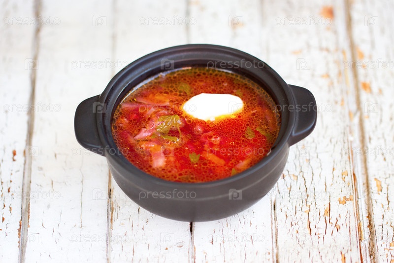 Красный борщ. Традиционное украинское блюдо. В небольшой кастрюле