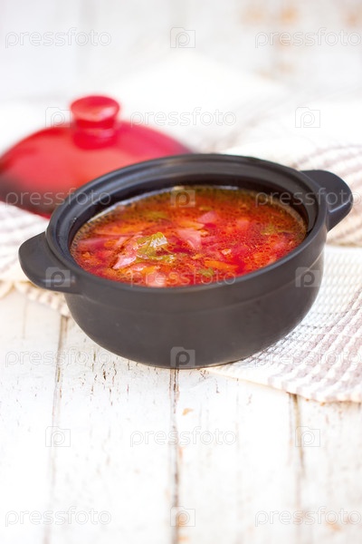 Красный борщ. Традиционное украинское блюдо. В небольшой кастрюле