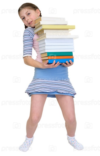 Девочка со стопкой учебников на белом фоне
