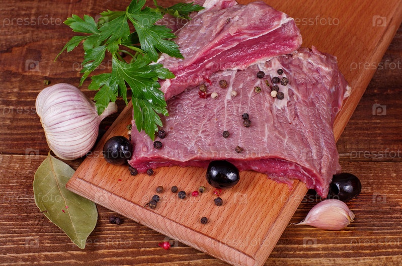 Сырое мясо и пряности на деревянных фоне