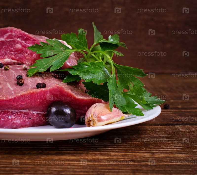 Сырое мясо и пряности на деревянных фоне