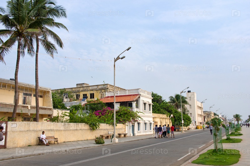 Люди на набережной в Пондичерри, Индия