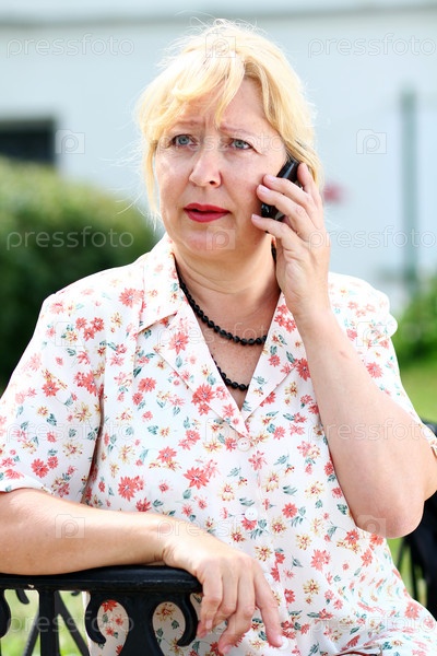 Зрелая женщина с сотовым телефоном на скамейке в парке