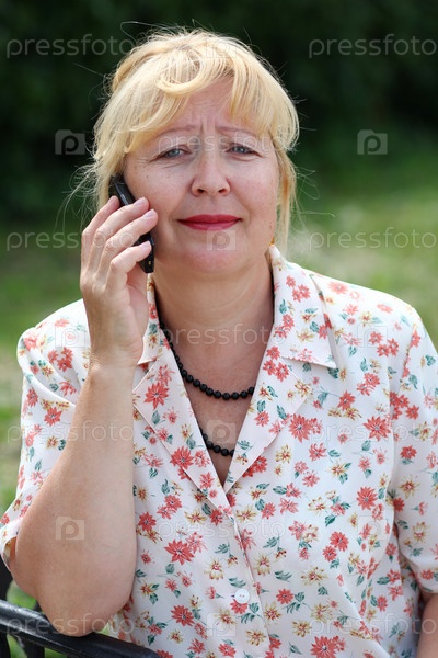 Зрелая женщина с сотовым телефоном на скамейке в парке