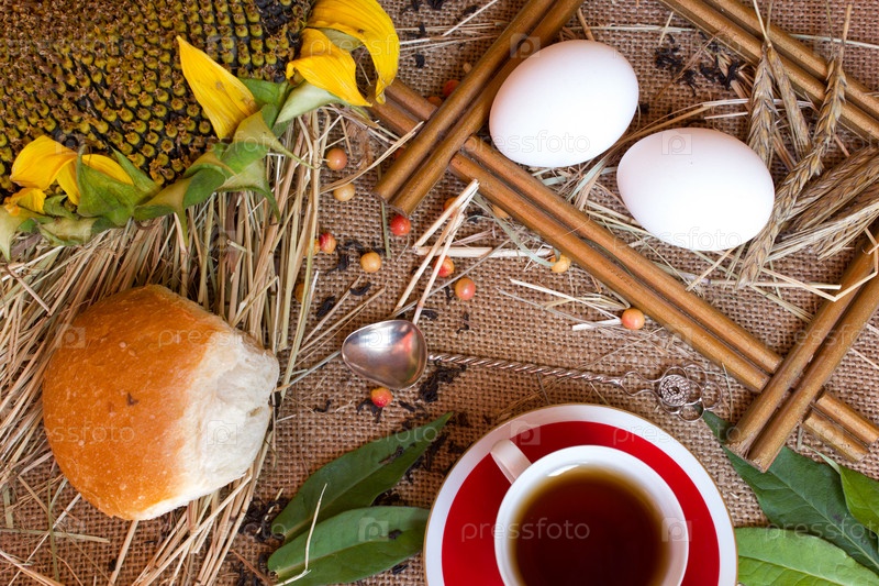 Колосья пшеницы, чай, чашки, подсолнечника, яйца и хлеб на мешковины