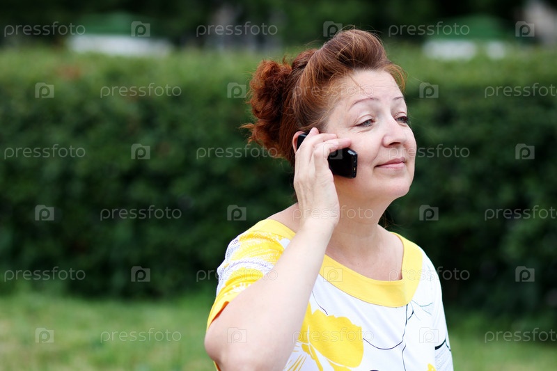 Портрет зрелой женщины с сотовым телефоном на фоне зелени
