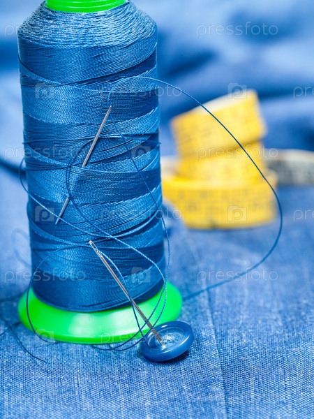 Нить шпульки, кнопка, мера ленты на голубой ткани