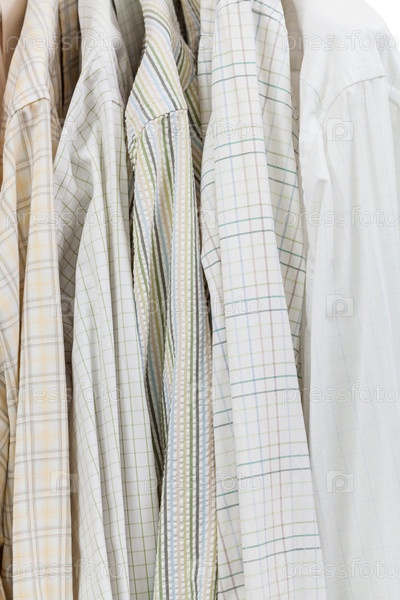 Различные рубашки на вешалки в шкафу