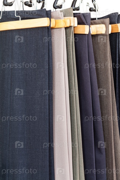 Различные шерстяные брюки на вешалках