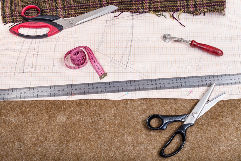 Раскройный стол с ткани, шаблон, пошив инструмент