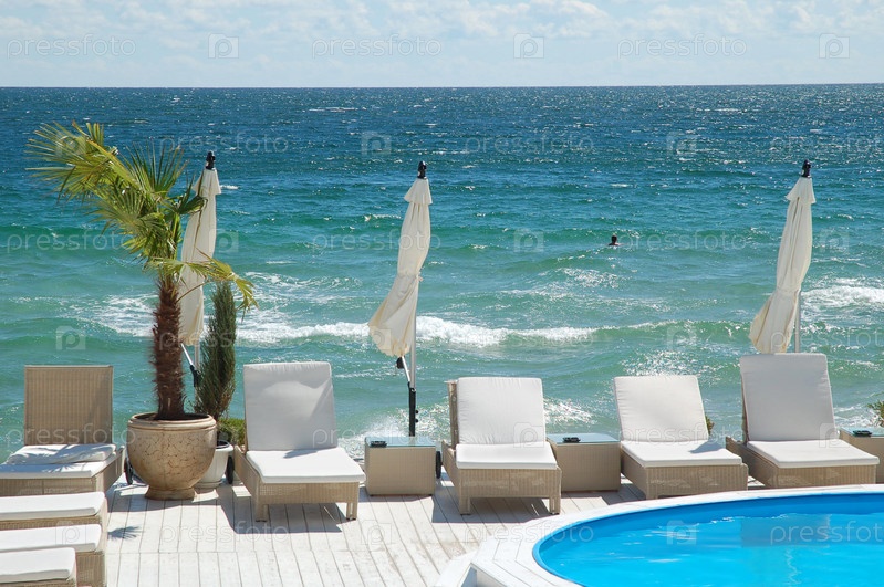 Зонты и шезлонги у бассейна под открытым небом в приморском отеле