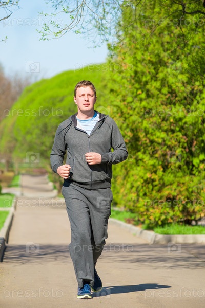 Молодой человек в сером костюме бежит