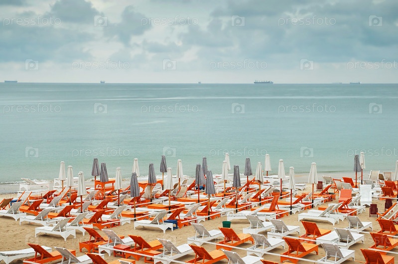 Шезлонги на морском пляже во время шторма