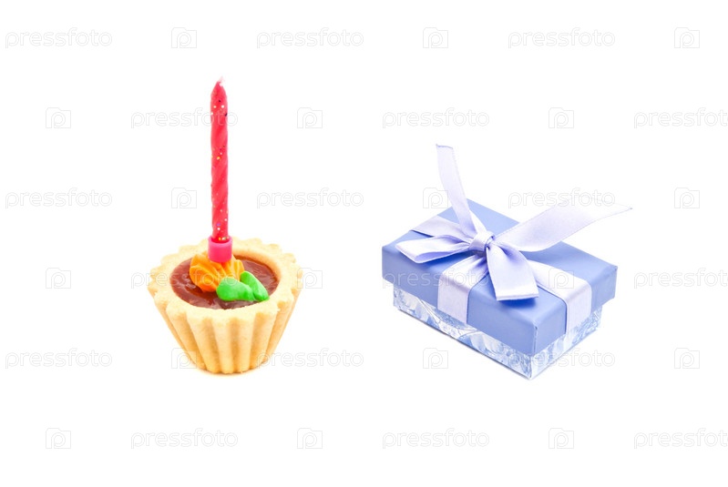 Торт с розовыми рождения свечи и подарок на белом