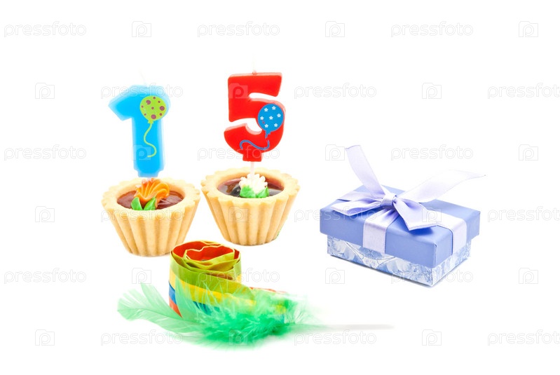 Торты с пятнадцати лет день рождения свечи, свисток и подарок на белом