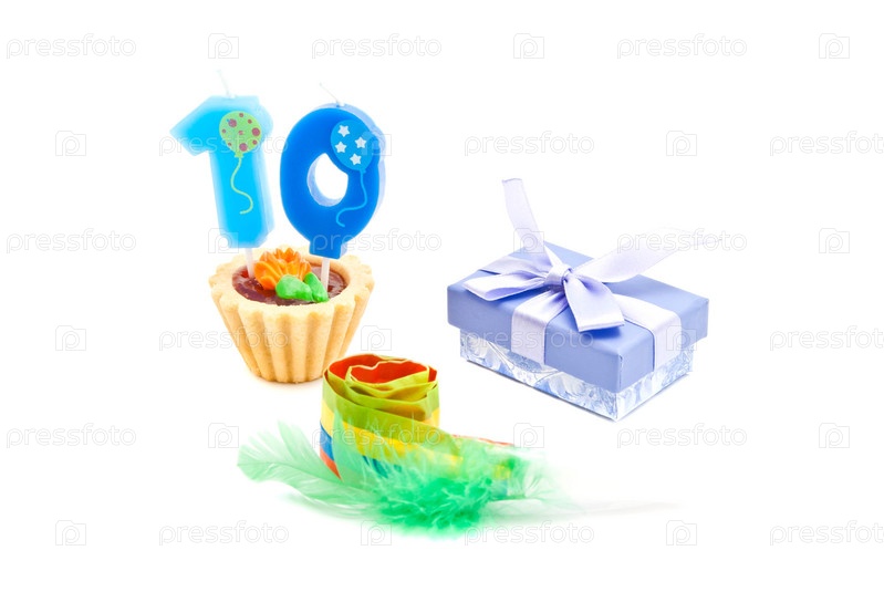 Торт с десяти лет день рождения свечи, свисток и подарок на белом