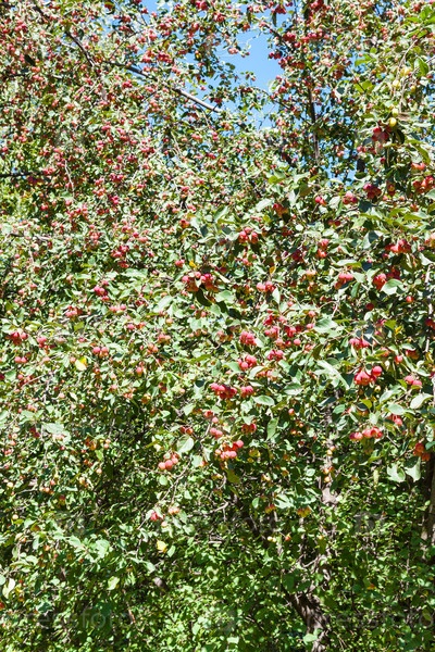 Дикое дерево с спелыми красными яблоками в лесу