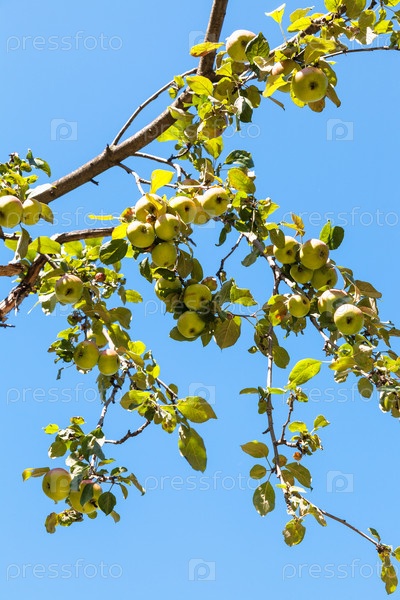 Спелые желтые яблоки на ветке дерева