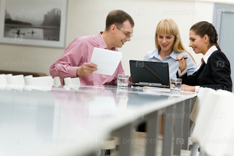 Изображение деловой группы, общающейся за столом и смотрящей на монитор ноутбука в мастерской