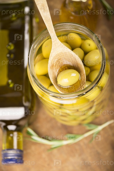 Оливки в банке, бутылка оливкового масла, Розмарин