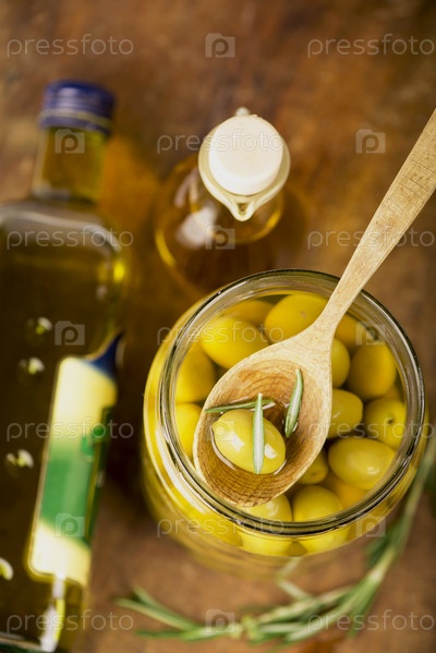 Оливки в банке, бутылка оливкового масла, Розмари
