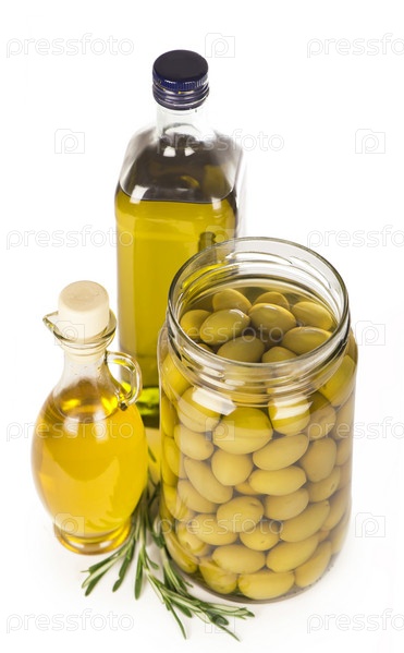 Зеленые оливки, сохранились в банке, бутылка оливкового масла, Розмарин