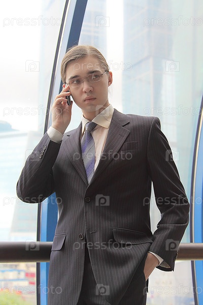 Деловой человек говорит по мобильному телефону, стоя у окна
