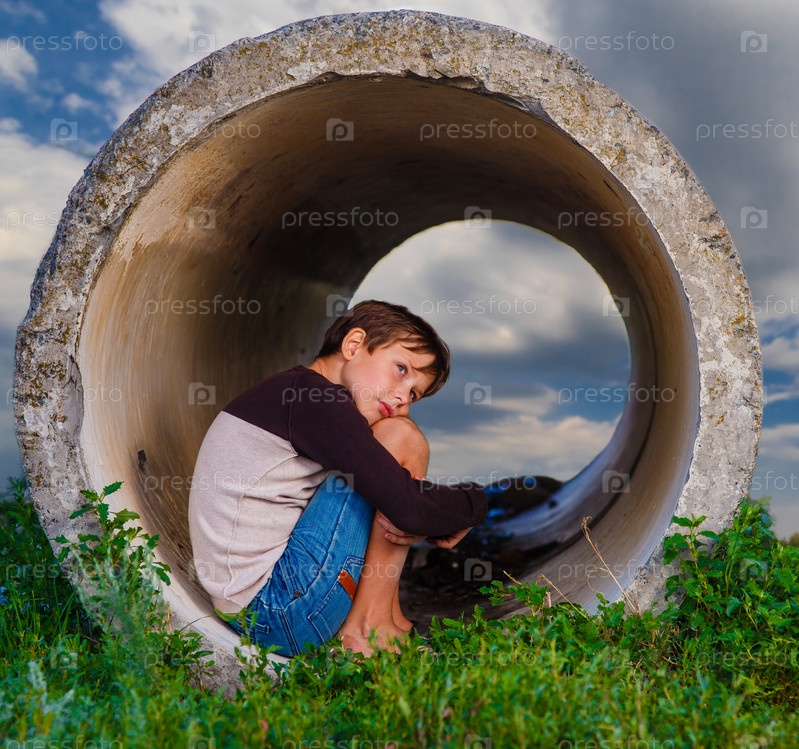 Бездомный подросток мальчик сидит в бетонных труб