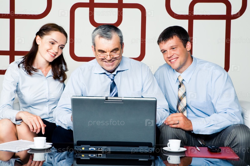 Изображение бизнесменов, смотрящих на монитор ноутбука во время встречи