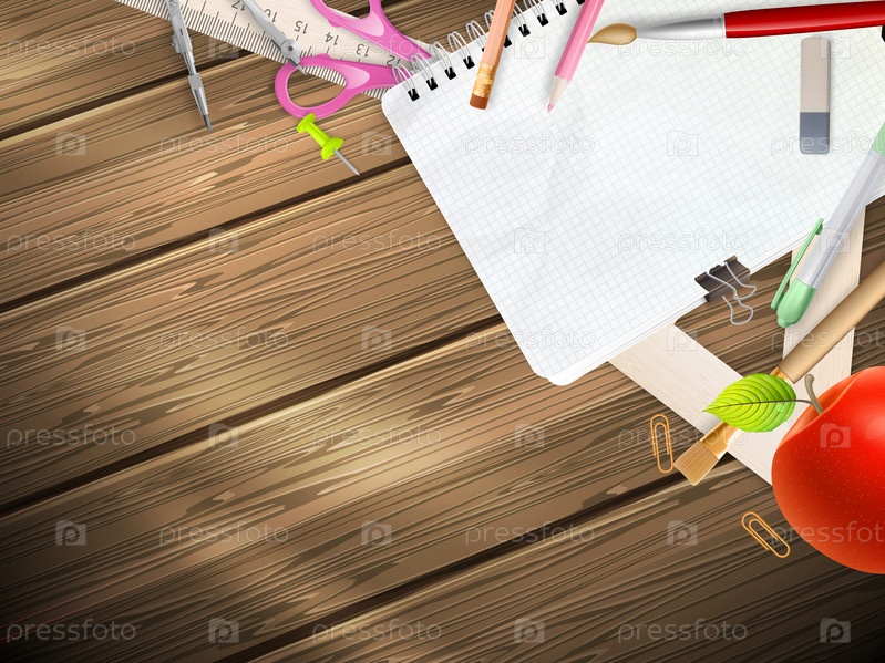 Школьные принадлежности на деревянном фоне. EPS 10