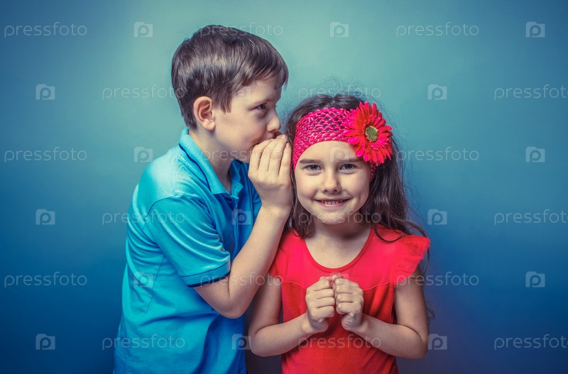 Мальчик-подросток, шепчет на ухо девушка на сером фоне