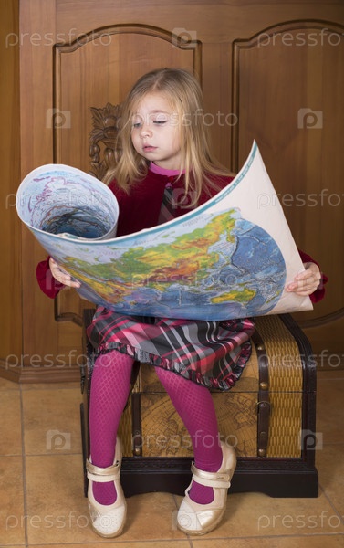 Маленькая девочка сидит на сундуке и рассматривает карту мира